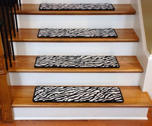 Beautiful Plush Premium Carpet Stair Treads by Dean Flooring Company. Zebra. Luxurious and resilient texture. High fashion design. Densely woven construction. Uncommon softness and durability. Made from premium quality broadloom. Stylish enough to compliment the finest decors. Color: Zebra. Stair treads are approximately 30 inches by 9 inches. Set includes 13 pieces. Each tread is machine serged with color matching yarn. Helps prevents slips on your hardwood stairs (treads must be securely attached to your stairs). Provides warmth and comfort. Extends the life of your hardwood stairs. Easy do-it-yourself installation with double sided carpet tape (sold separately).