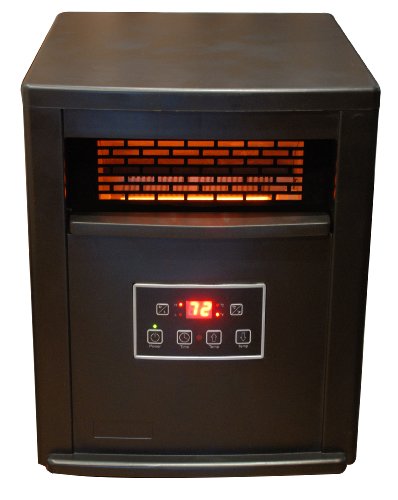 1500 watts infrared heater with 4 quartz elements. Heats up to 1000 Sq.Ft as a supplimental heater. Black plasitc Cabinet. Digital control with remote. Product dimension: H 16"XL 16"XW13"