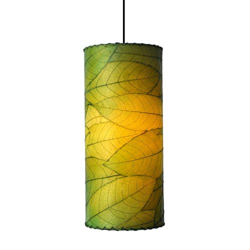 Made from Fossilized Cocoa Leaves dyed with organic dyes and applied with non-toxic adhesives wrapped horizontally around the shade, this ceiling pendant can replace any ceiling light and add color to any setting. Handmade, from Renewalbe Materials. Uses 1 Compact Flourescent bulb (not included). UL Approved. Color: Green. 7 in. L x 7 in. W x 16.5 in. H (2 lbs.)