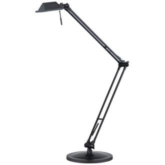 Desk lamps are a must-have when setting up a study area or work desk. This classic, twin-arm design swivels and adjusts into a variety of positions. It comes in a sleek black matte finish with an adjustable shade head. Matte black finish. Adjustable arm and head. Includes one 50 watt halogen bulb. Full range cord dimmer. Adjustable to 35" high. 8" diameter footprint.