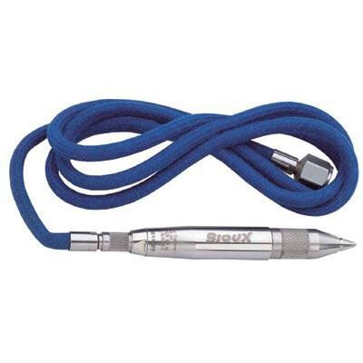 672-5980 This item features: -Non-marring cover over leader hose. -High quality stainless steel housing. -Replaceable engraving points. -Cycle Rate: 13000 blows/min. -Inlet Size: 1/4 in (NPT). -Hose Length: 59.0 in. -Control Type: Twist Throttle. -Includes: 45° Carbide Tipped Point. -Price is for 1 Each.