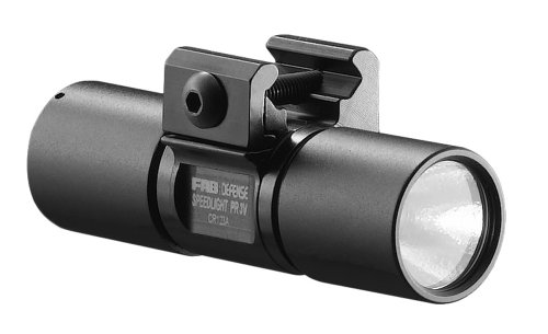 SpeedLight allows operator to utilize 100 to 120 lumens of white light illumination from a single CR123A lithium 3V battery. Comes with built in Picatinny mount. LED assembly means no broken bulbs and over an hour of continuous illumination from one battery. Ambidextrous push button activation. Momentary or constant illumination. Light housing is built from aerospace aluminum, hard anodized to military specifications.