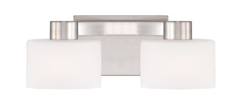Finish:Brushed Nickel, Glass:Opal Etched Glass, Light Bulb:(2)100w T4 G9 120v Halogen This sleek collection gives a solid nod to contemporary design. The opal etched glass compliments the brushed nickel finish and is sure to enhance your bath.